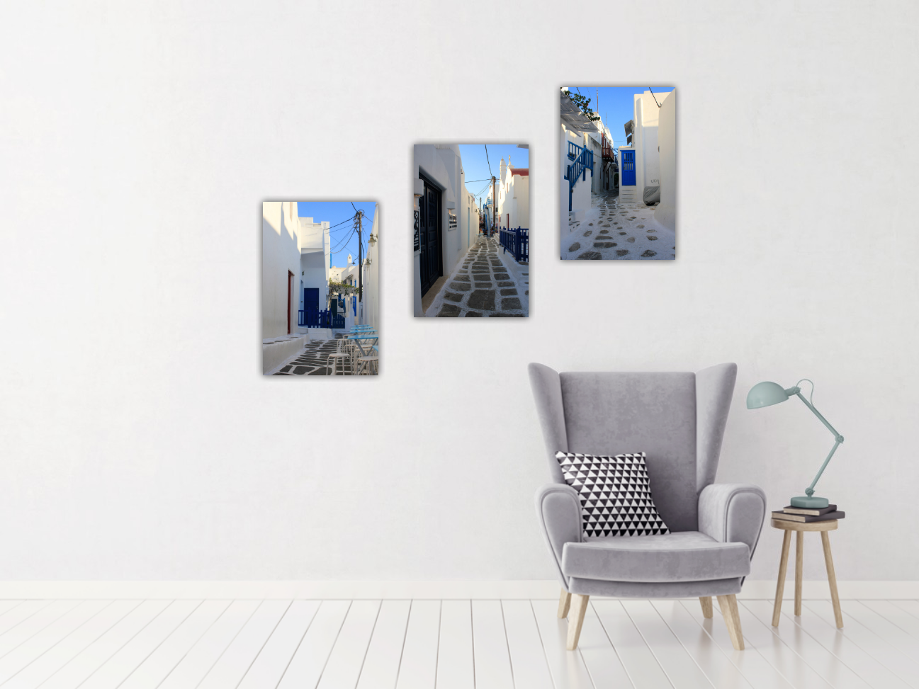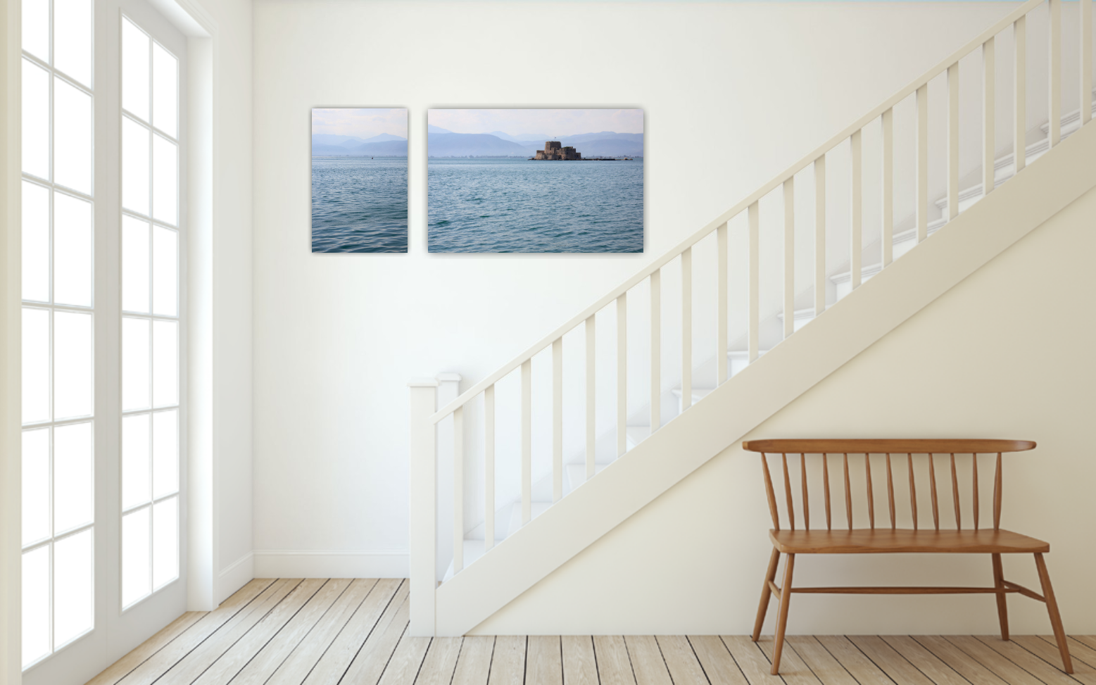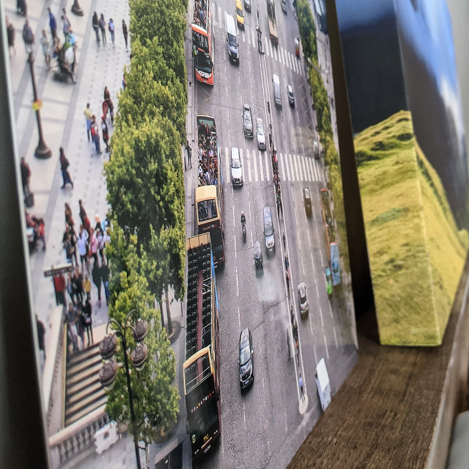 Details of a vibrant gloss metal print and a fine art canvas with a mirrored edge.
