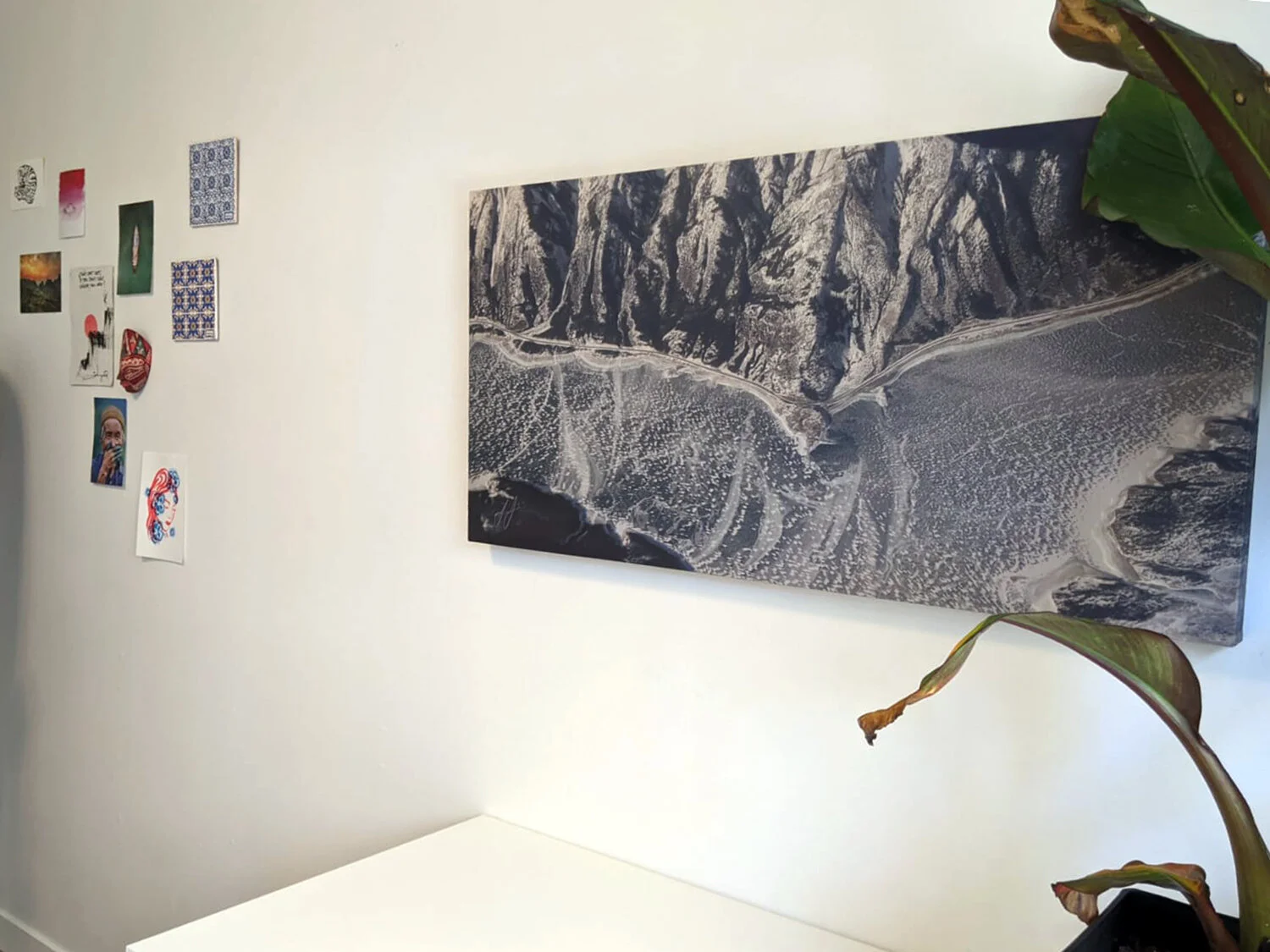 Fine art canvas hanging on a white wall with adjacent room décor [20x40”]